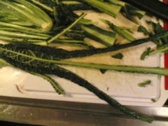 Tagliare il cavolo nero grossolanamente, affettare la zucca a piccoli pezzi piuttosto sottili, io avevo dei pezzi triangolari e quindi ho ottenuto delle fettine triangolari.